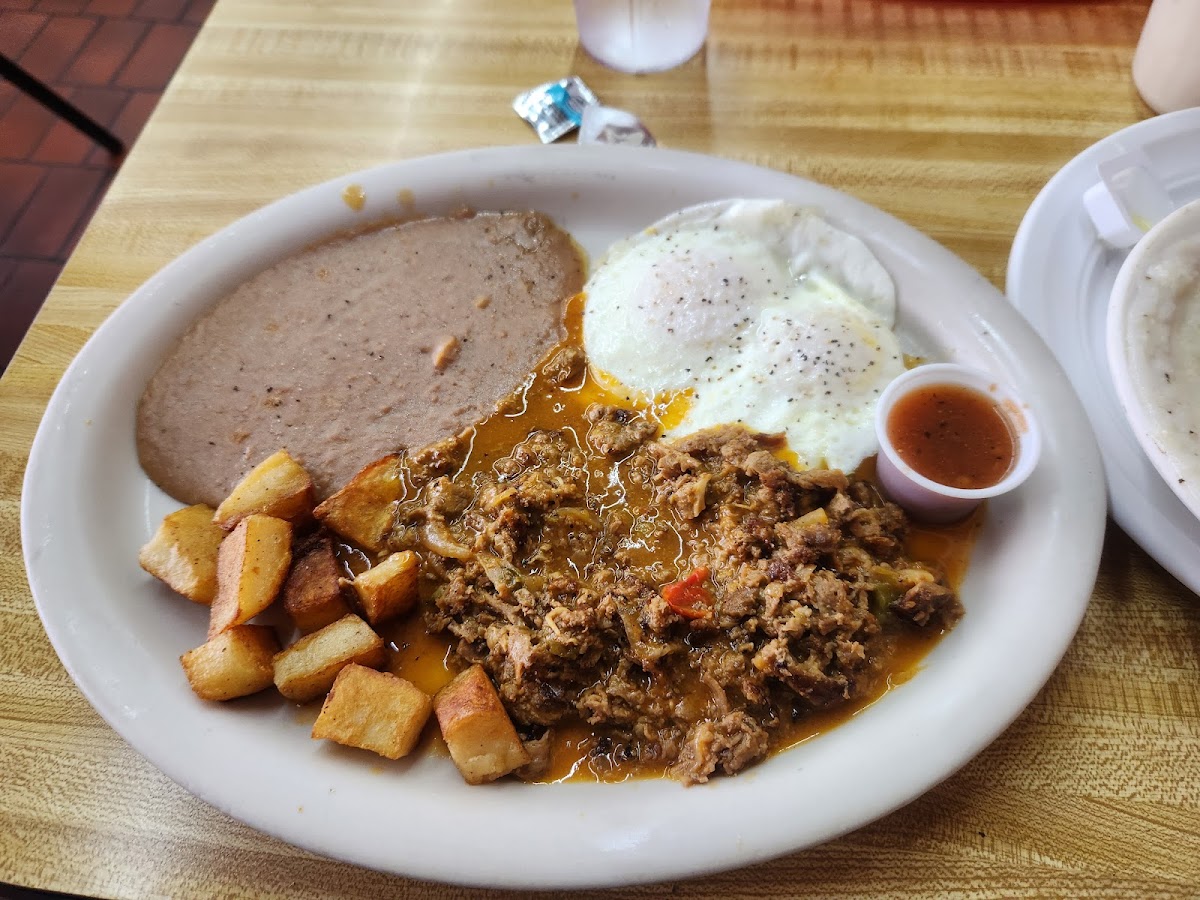 The menu leans heavily into breakfast and brunch favorites, including options like Steak Ranchero Breakfast, Chicken Fried Steak and Eggs, and various takes on classic Tex-Mex morning dishes such as Chorizo Con Huevo and Ranchero Eggs. The presence of a senior menu shows an inviting nod to the neighborhood’s older crowd, making it a community spot where generations mingle. Portions are generous and priced reasonably, which suits families, groups, and anyone looking for substantial value.